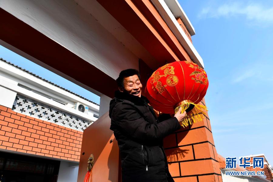 2月4日,在鄄城县旧城镇六合社区(三合村村台),陈百藏挂上灯笼。