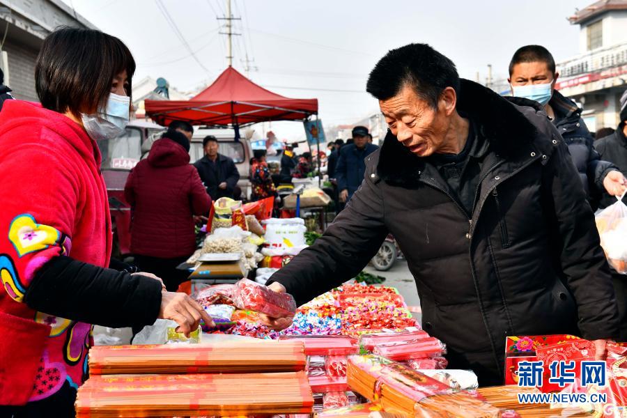 2月4日,在鄄城县旧城镇,陈百藏(前右)在购买年货。新华社记者 王凯 摄