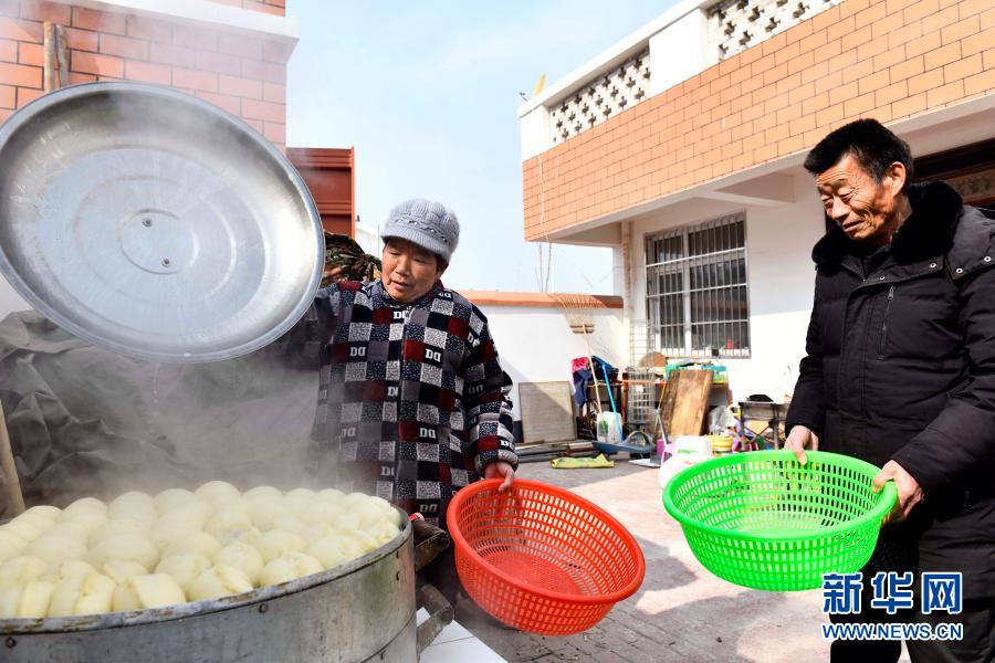 2月4日,在鄄城县旧城镇六合社区(三合村村台),陈百藏和爱人在蒸包子和馒头,准备过年吃。新华社记者 王凯 摄