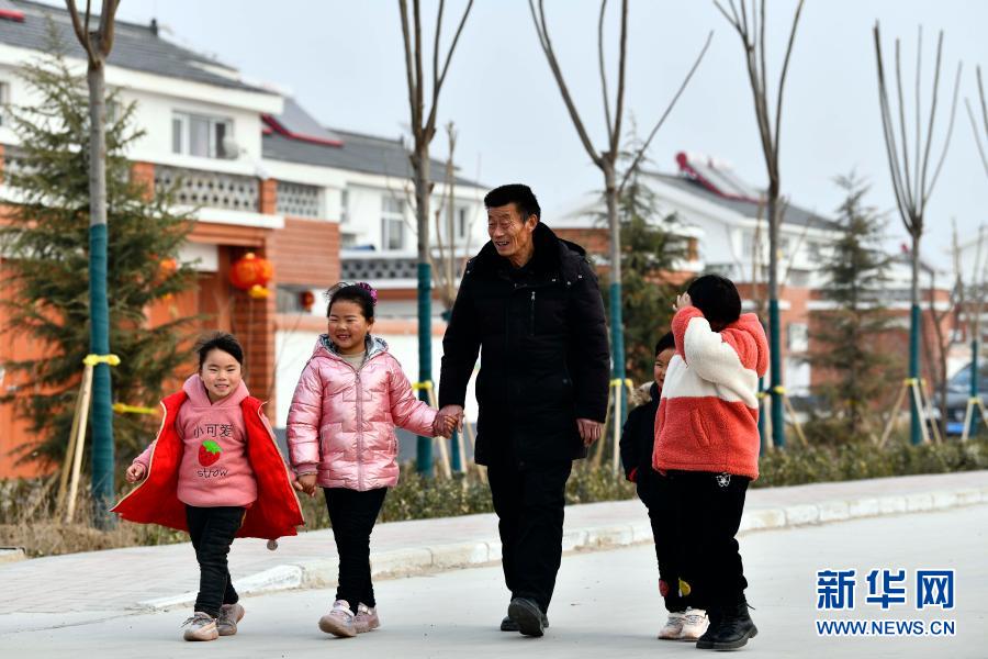 2月4日,在鄄城县旧城镇六合社区(三合村村台),陈百藏领着孙女们去超市。新华社记者 王凯 摄