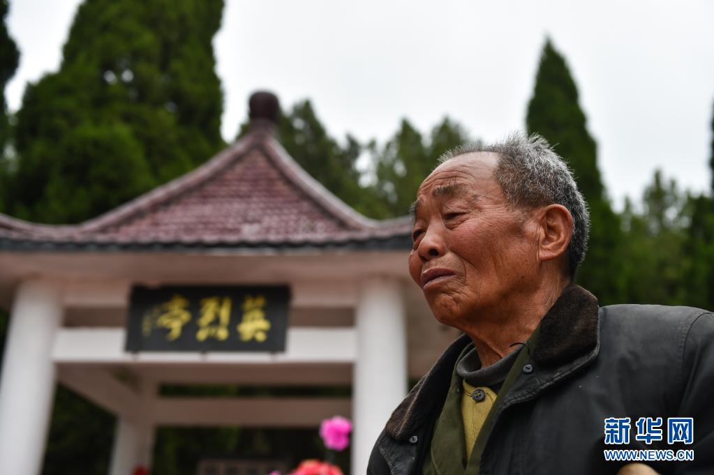4月1日,在泗县大杨乡东赵集烈士陵园,赵贤军倾听前来祭奠的泗县黄圩镇中心学校的学生代表发言。新华社记者 韩旭 摄