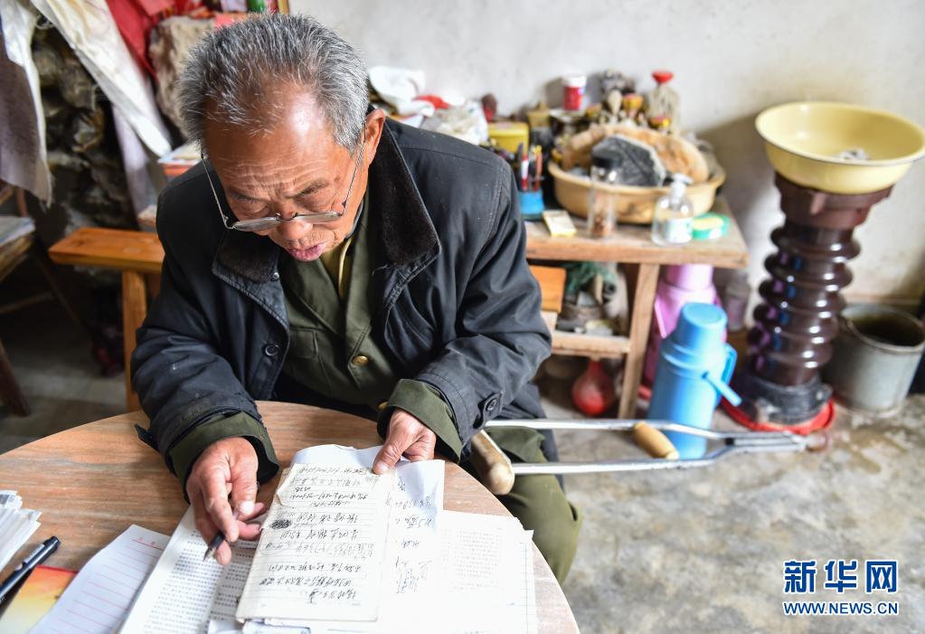 4月2日,赵贤军在泗县大杨乡的家中翻看寻找烈士家属相关线索的笔记本。新华社记者 韩旭 摄