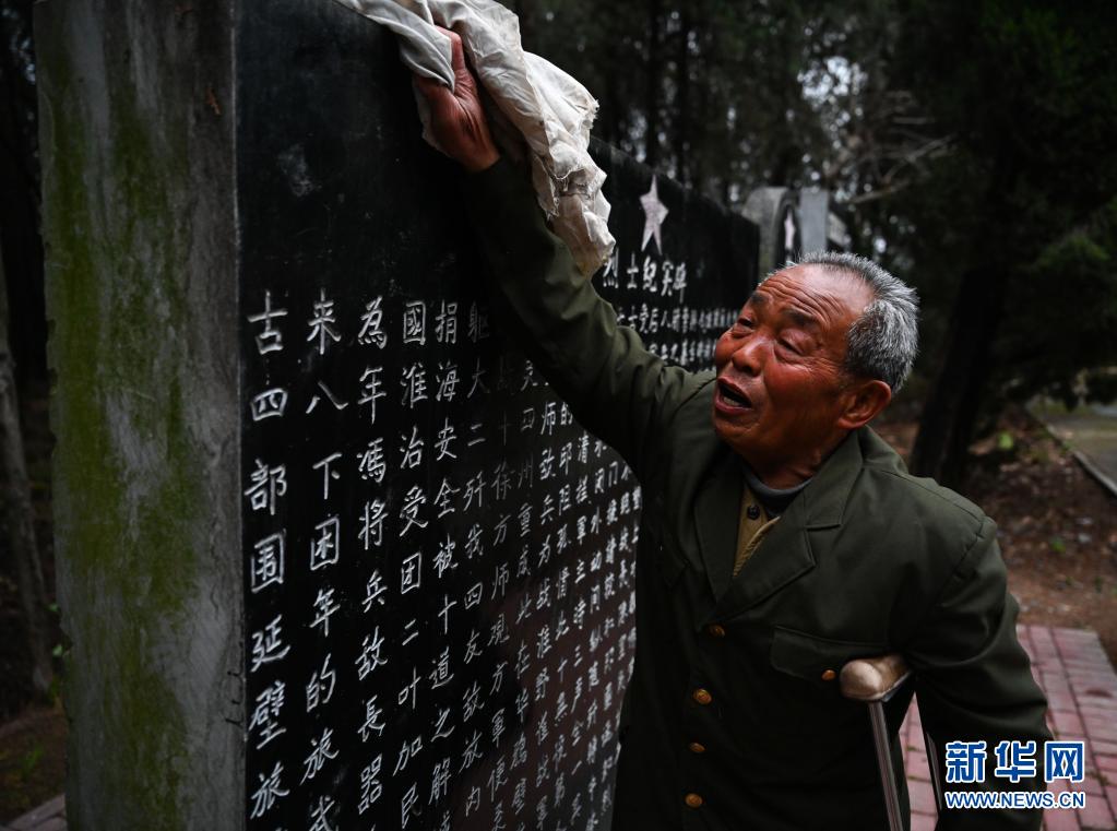 3月31日,赵贤军在泗县大杨乡东赵集烈士陵园擦拭墓碑。新华社记者 韩旭 摄