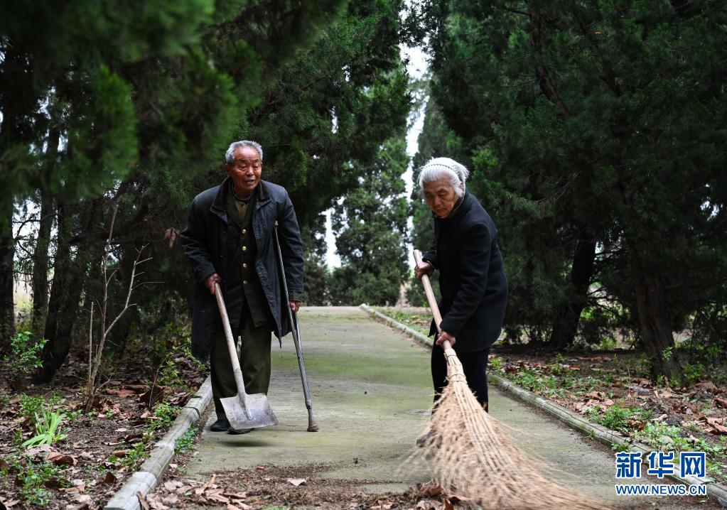 4月1日,赵贤军和老伴吴侠在泗县大杨乡东赵集烈士陵园里打扫卫生。新华社记者 韩旭 摄
