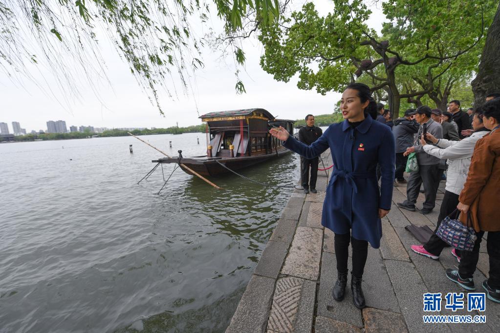 4月14日,张一在南湖湖心岛红船旁为游客讲解。