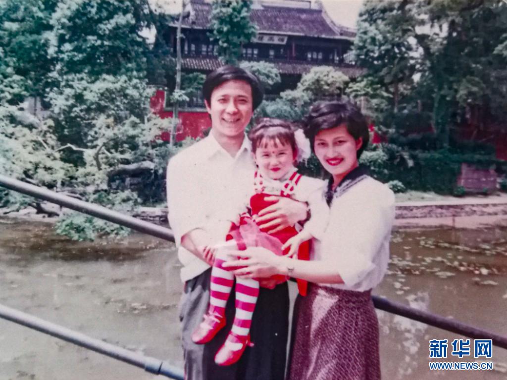 上世纪80年代,张新志(左)、张一(中)和徐金巧一家人在嘉兴南湖湖心岛烟雨楼前合影。新华社发(受访者供图)