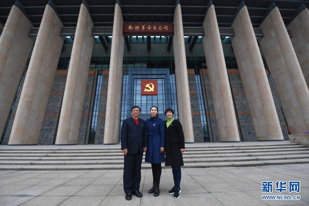 4月14日,张新志、徐金巧夫妇和女儿张一(中)在嘉兴南湖革命纪念馆前留影。新华社记者 徐昱 摄