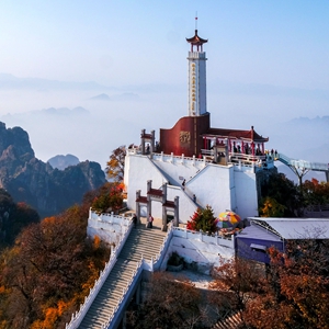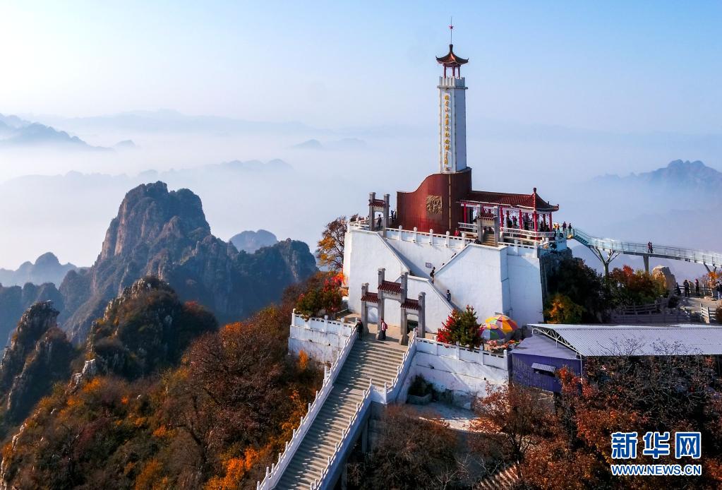这是狼牙山棋盘陀峰顶的“狼牙山五勇士纪念塔”(2017年10月27日摄,无人机照片)。