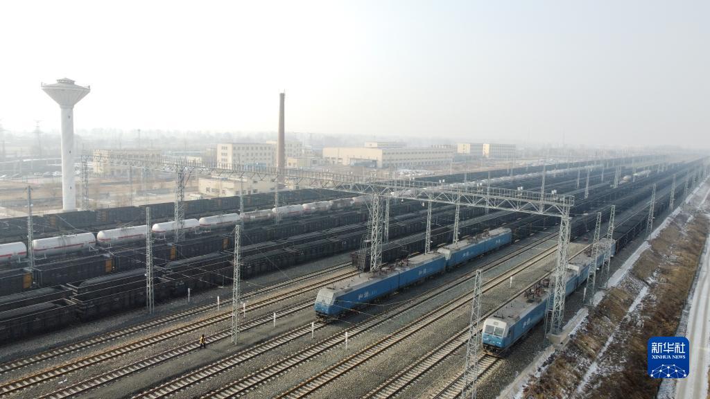 12月9日,多趟万吨煤炭列车停靠在呼和浩特南站站场内(无人机照片)。