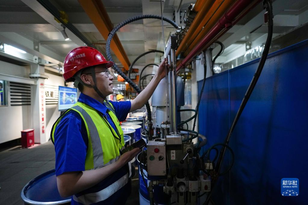 在盾构机推进一环结束后的管片拼装期间,黄鲁在测量京华号盾尾油脂(4月19日摄)。