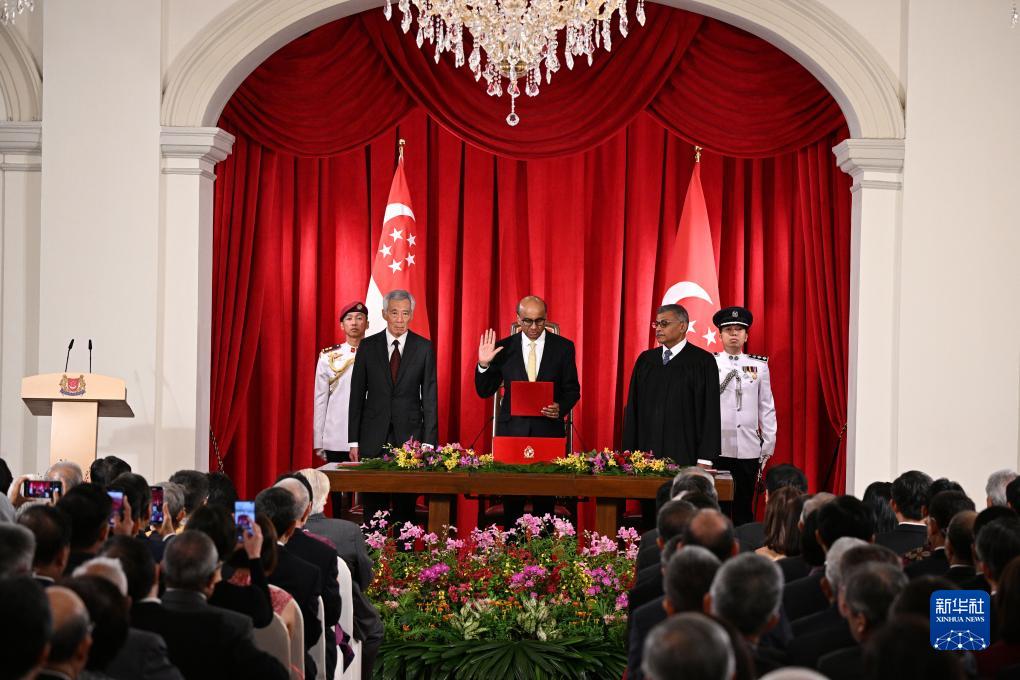 9月14日,当选总统尚达曼(中)在新加坡总统府宣誓就职。
