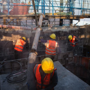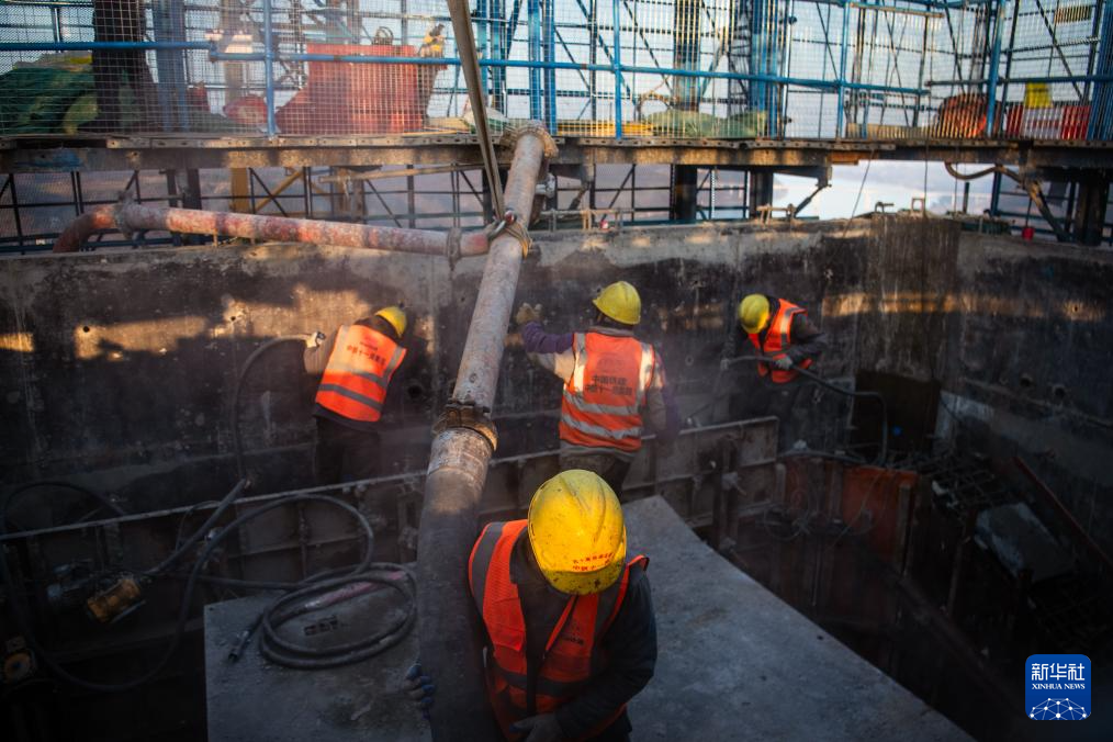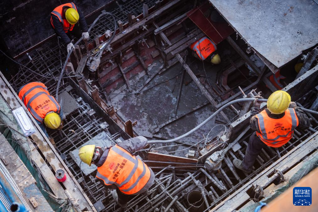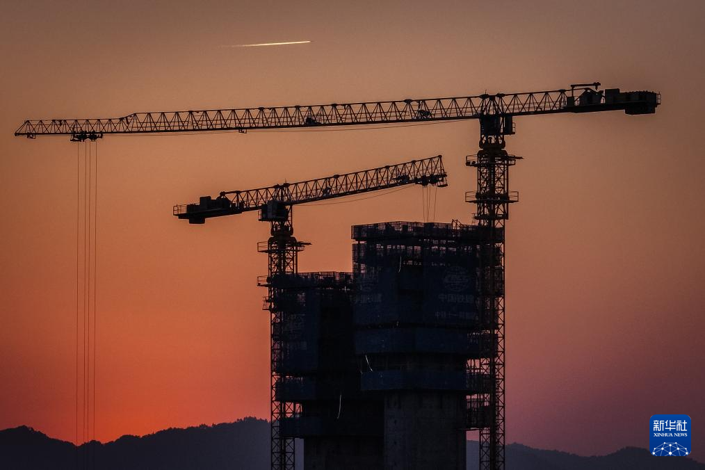 12月24日,中铁十一局工人在P4主塔塔顶进行混凝土浇筑施工作业。