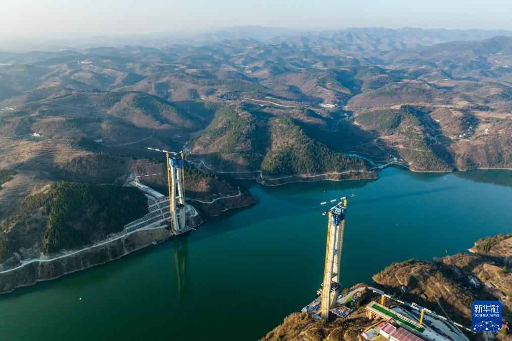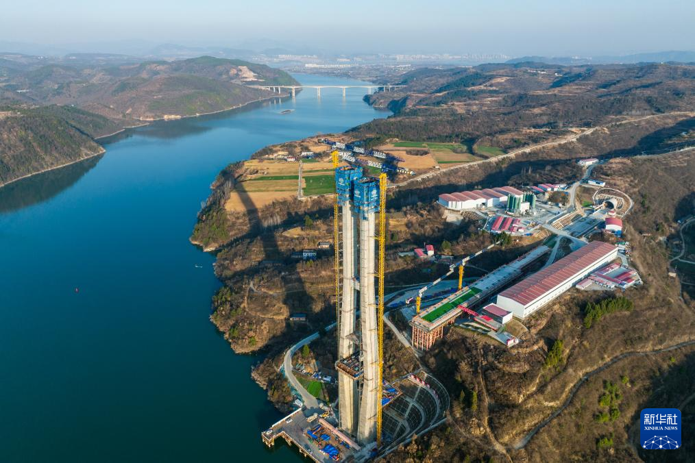 12月24日拍摄的汉江特大桥两岸主塔施工现场(无人机照片)。