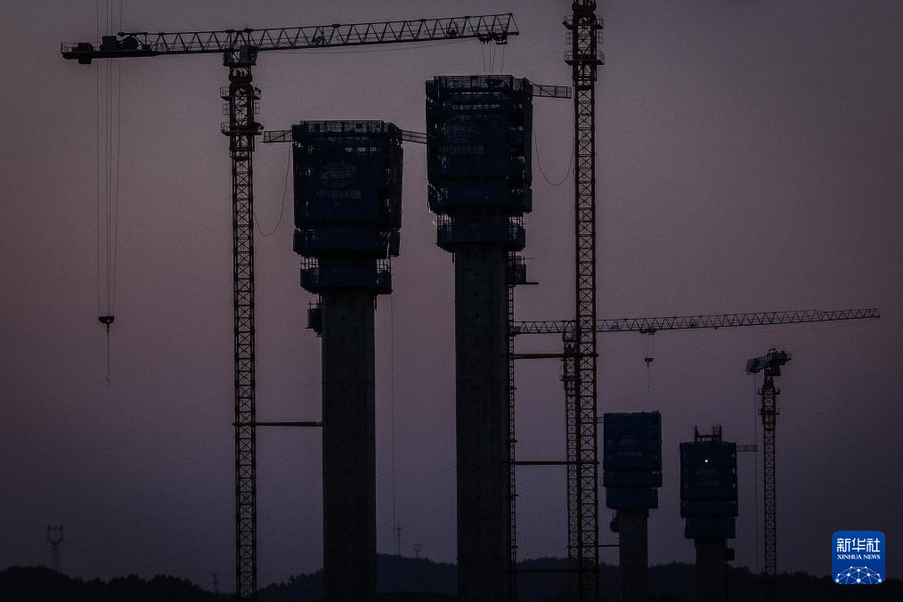 当日,由中铁十一局承建的西(安)十(堰)高铁汉江特大桥P4主塔顺利封顶。汉江特大桥位于湖北省十堰市,是一座梁桁组合结构斜拉桥,全长917.45米,P3、P4两座主塔高度均为186.5米,共设置80对斜拉索,主跨420米。
