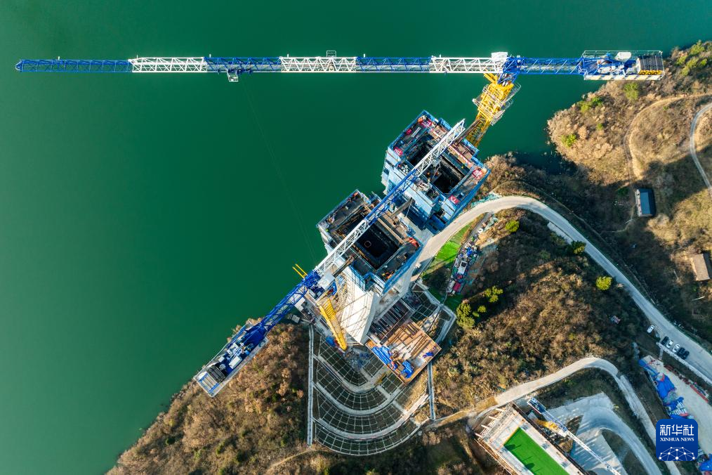 12月24日拍摄的汉江特大桥P4主塔施工现场(无人机照片)。