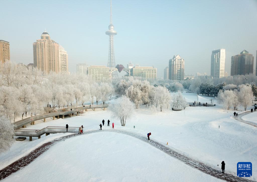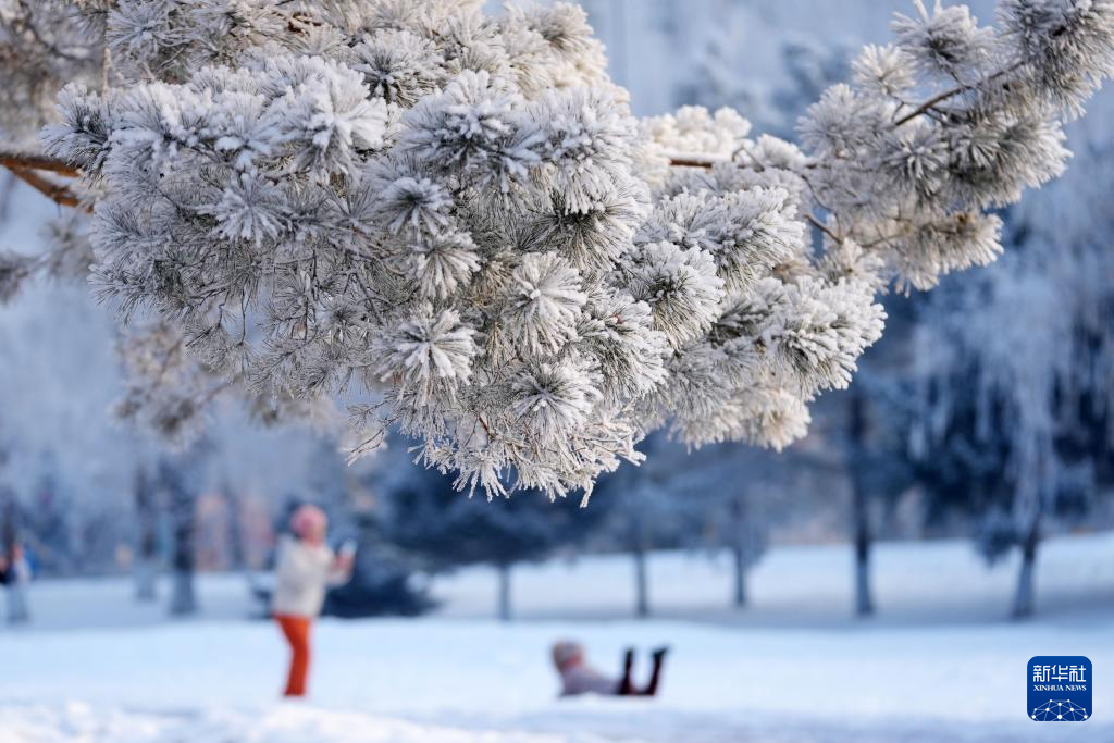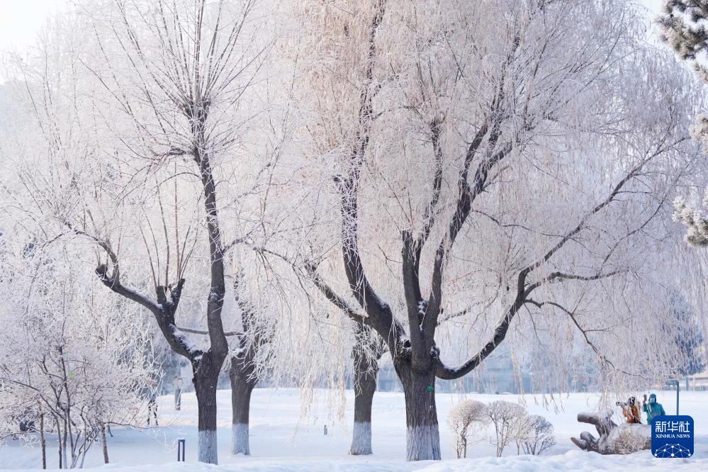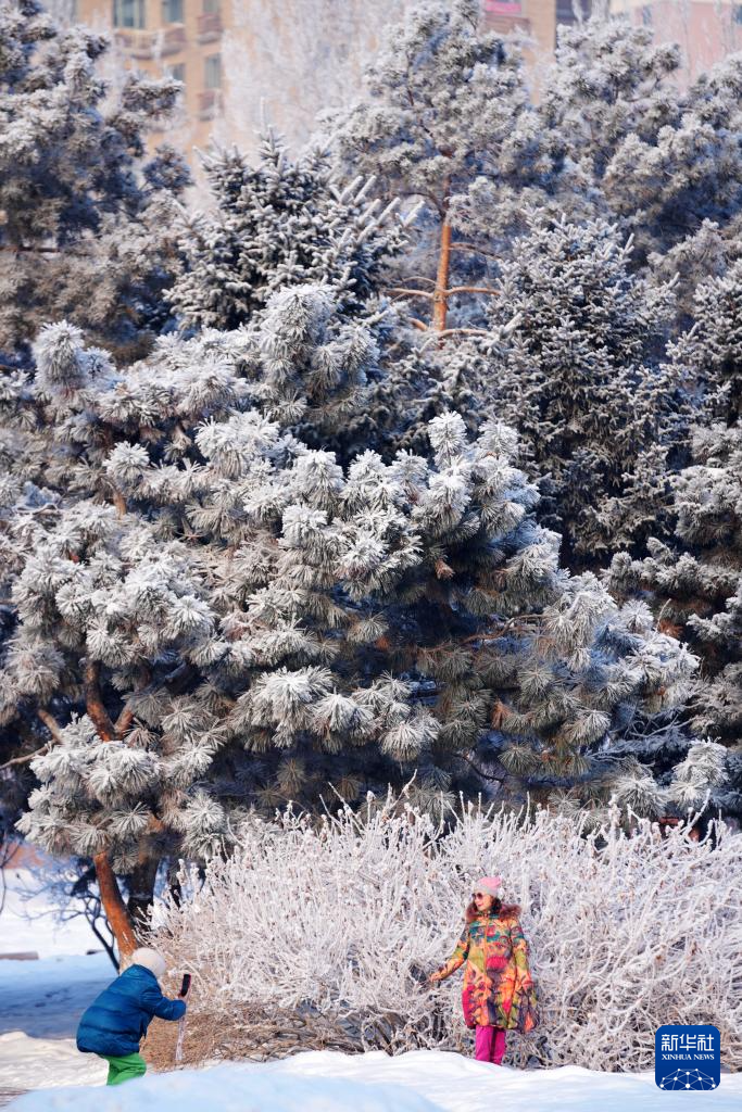 当日,降雪后的冰城哈尔滨市出现雾凇景观,大地银装素裹,玉树琼枝美如画卷。