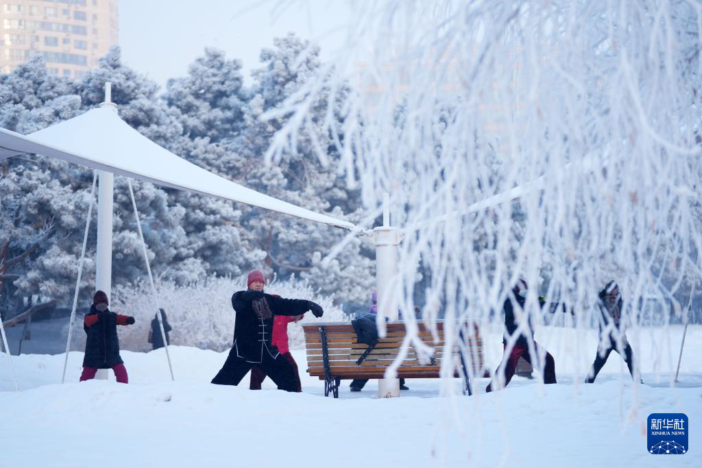 1月3日,市民在哈尔滨市湘江公园的雾凇景观旁打太极拳。