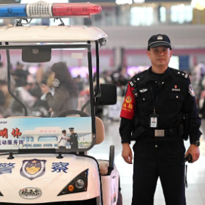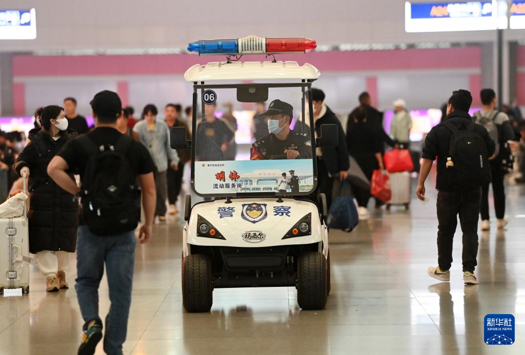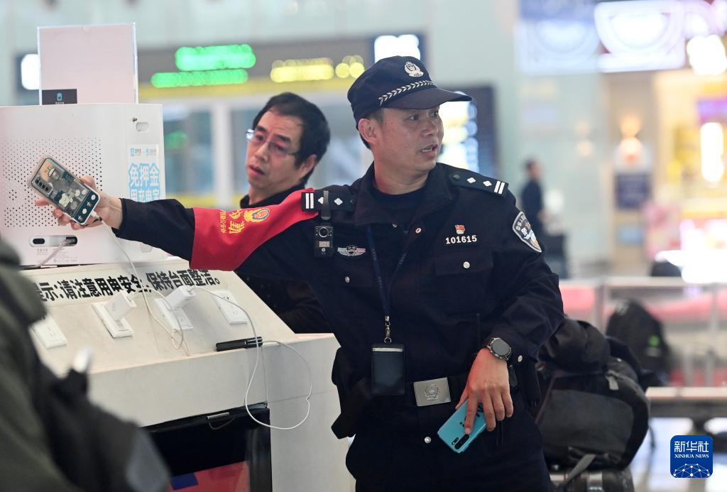1月8日,高明伟在南宁东站提醒旅客充电时要注意手机不要离开自己的视线。