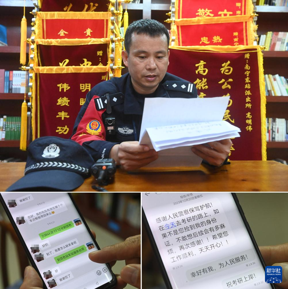这是一张拼版照片,上图是1月8日,高明伟在南宁东站派出所阅读旅客发来的感谢信;下图是旅客发来的感谢信息。