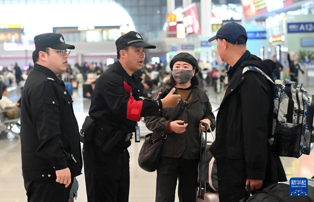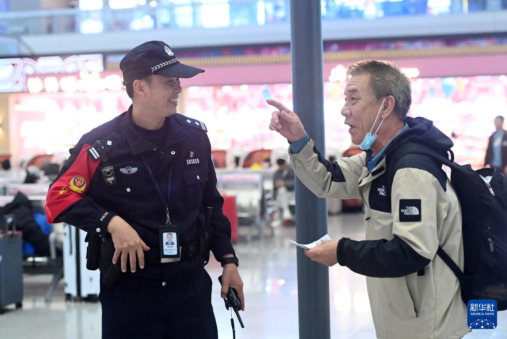 1月8日,高明伟(右一)在南宁东站向旅客解答问题。