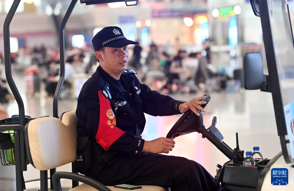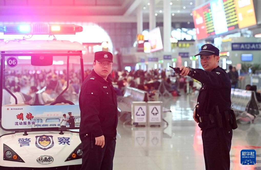1月8日,高明伟(右)和同事在南宁东站执勤。