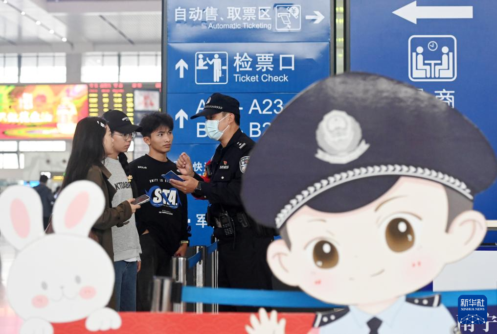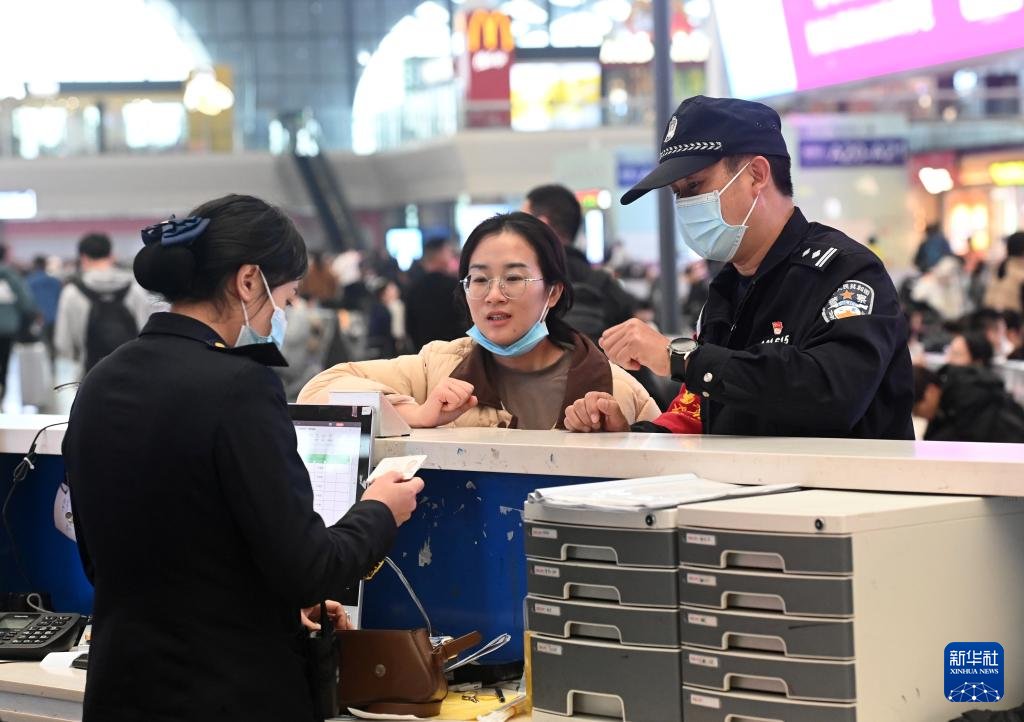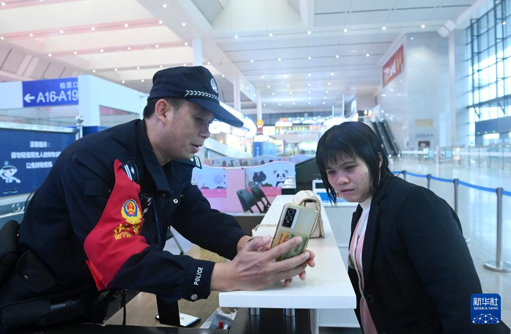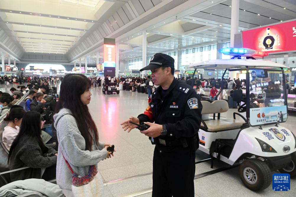 1月8日,高明伟在南宁东站向一名身份证失而复得的旅客讲解出行安全有关问题。