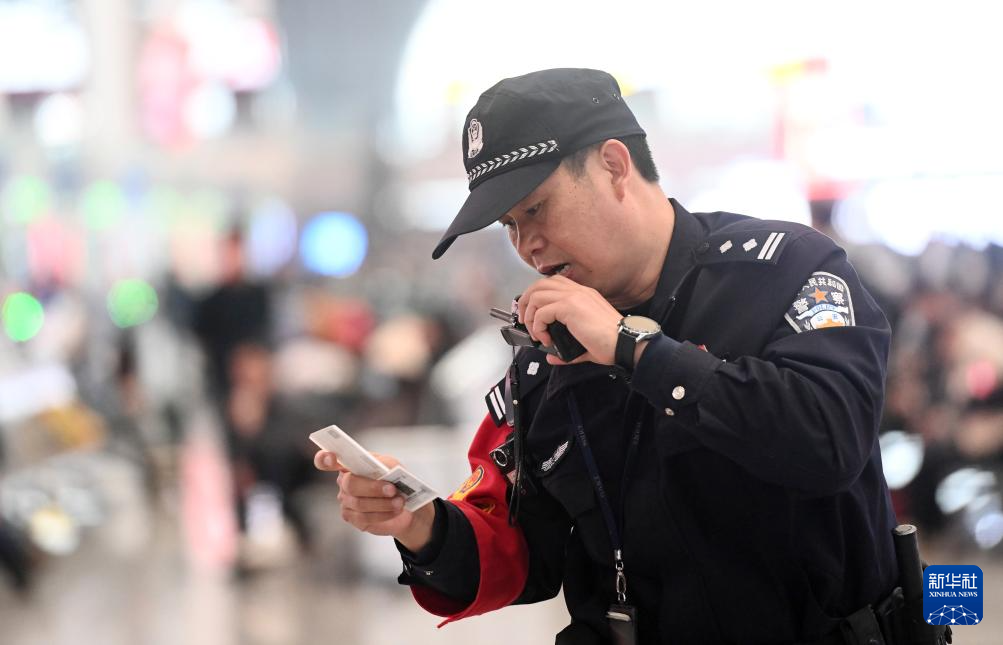 1月8日,高明伟在南宁东站用对讲机向同事报告旅客遗失证件有关信息。