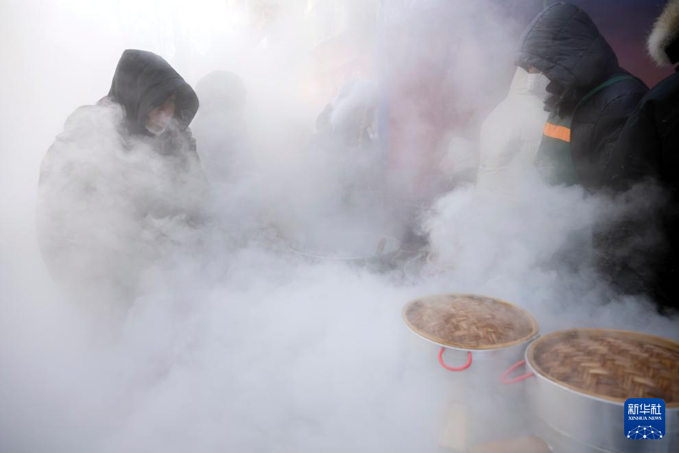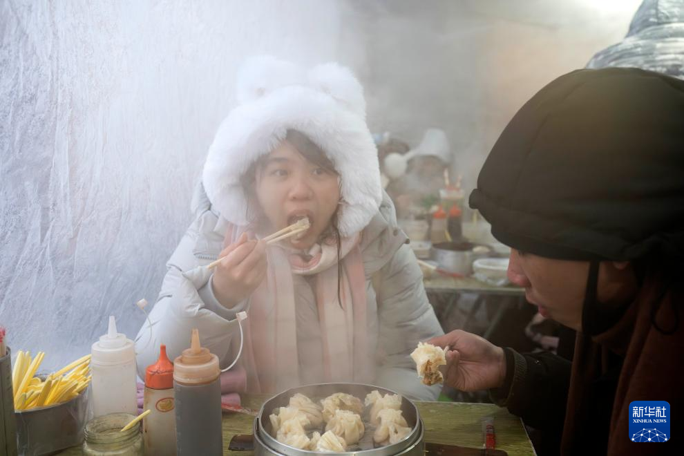 在哈尔滨红专街早市,游客在摊位上吃烧卖(1月22日摄)。