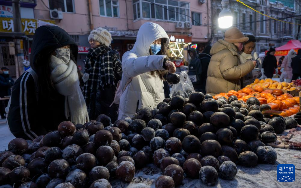 在哈尔滨红专街早市,游客挑选冻梨和冻柿子(1月22日摄)。