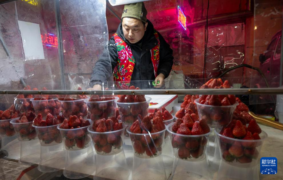 在哈尔滨红专街早市,摊主在售卖草莓(1月22日摄)。