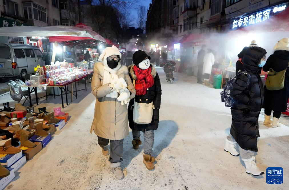 在哈尔滨红专街早市,游客穿着厚厚羽绒服逛街(1月22日摄)。