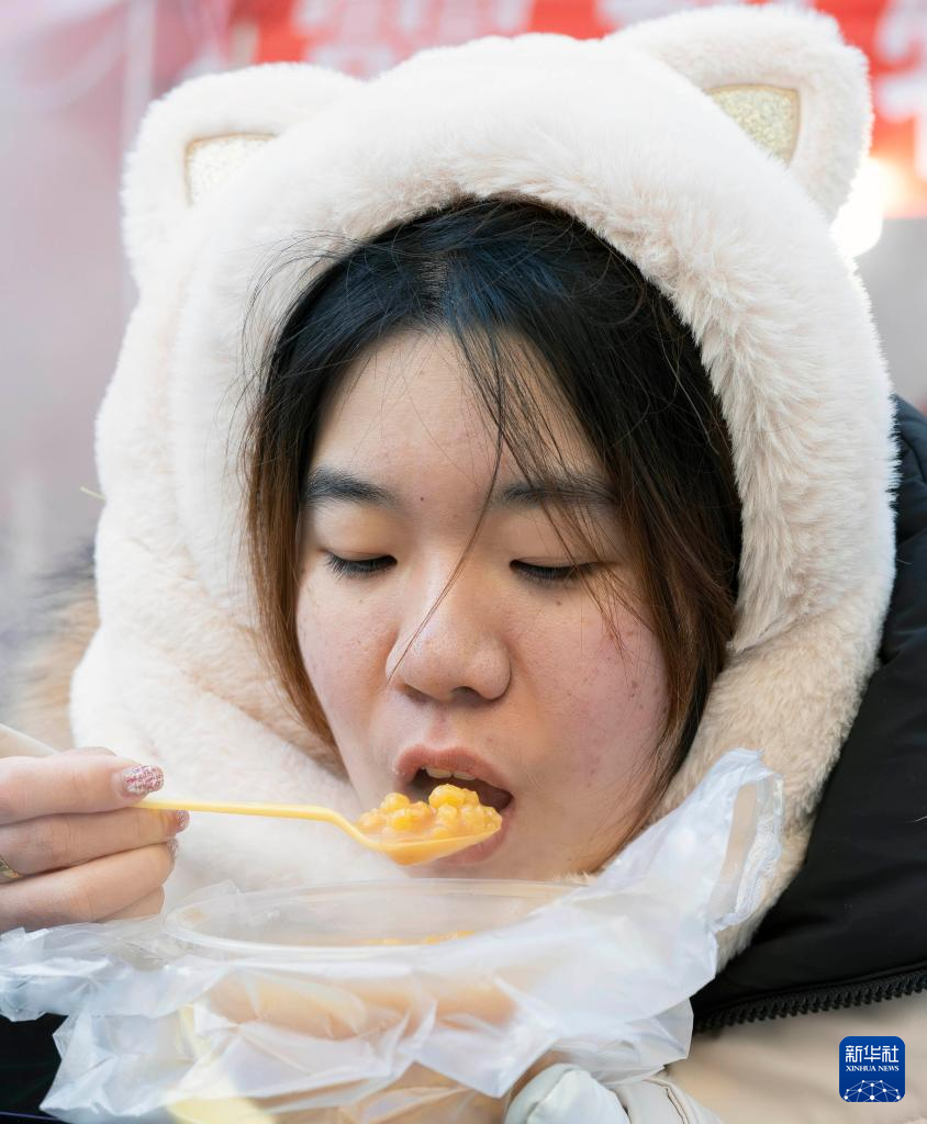 在哈尔滨红专街早市,游客在享用当地特色大碴子粥(1月22日摄)。