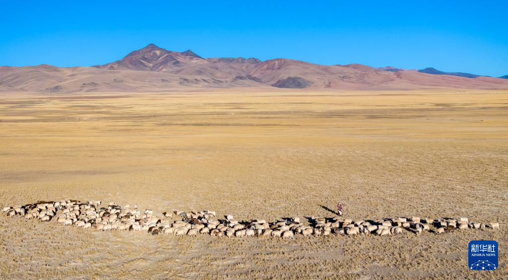 丹增在西藏那曲市尼玛县俄久乡马迁村老家的草场上牧羊(2023年12月18日摄,无人机照片)。