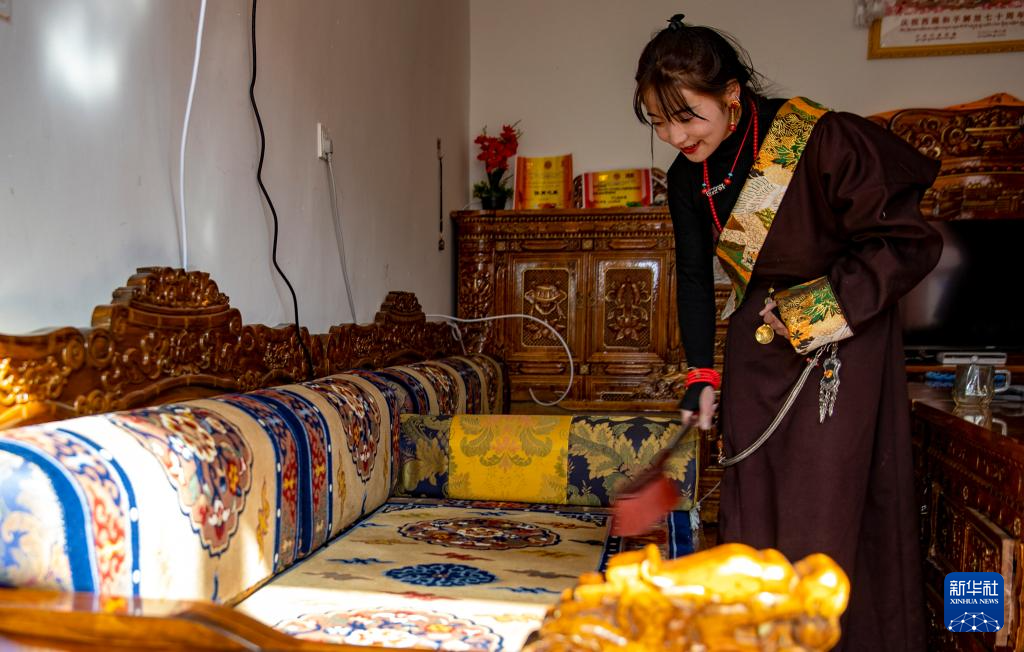 丹增在森布日生态搬迁安置点的新家打扫房间(1月24日摄)。
