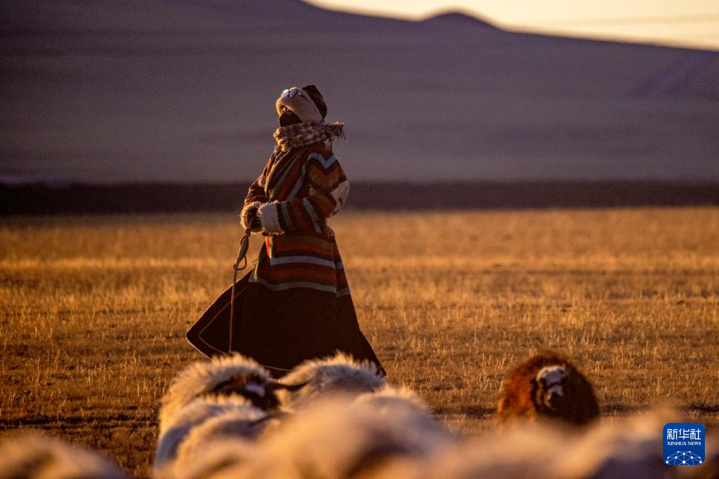 丹增在尼玛县俄久乡马迁村老家的草场上牧羊(2023年12月18日摄)。