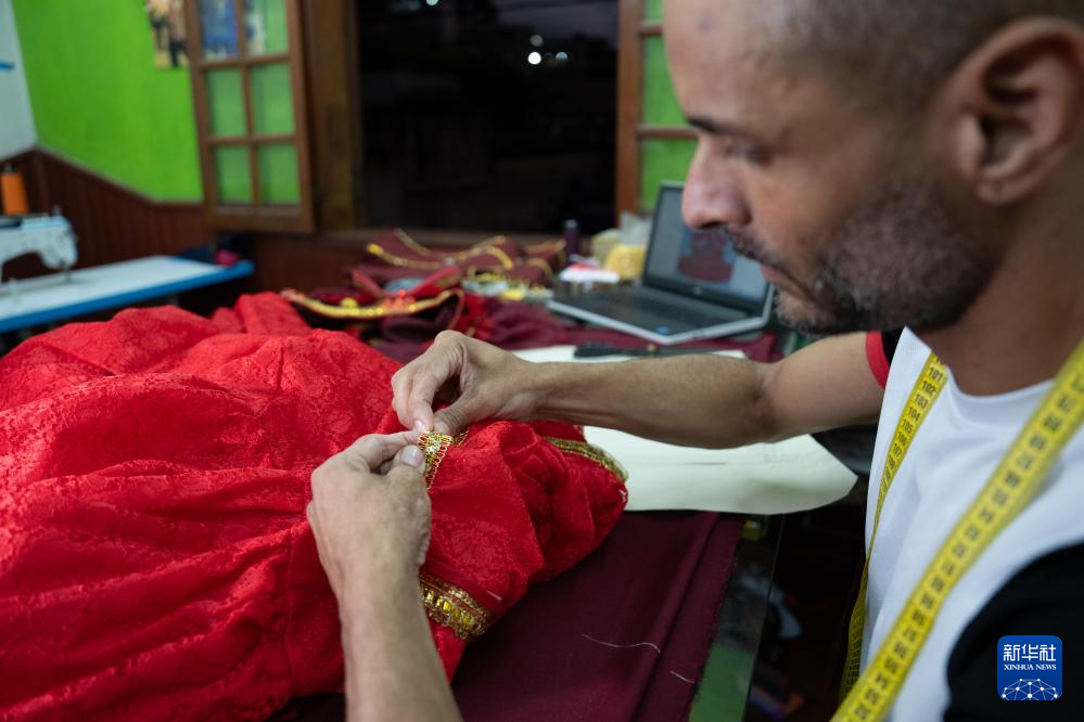 1月24日,在巴西贝洛奥里藏特,毛罗·恩里克·德奥利韦拉·梅洛在裁缝工作室制作“紫禁城方阵”的服装。