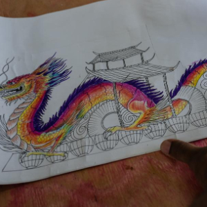 1月24日,在巴西贝洛奥里藏特市的一个作坊里,工人展示为“城市花园”桑巴舞校设计的“中国龙”造型花车图纸。