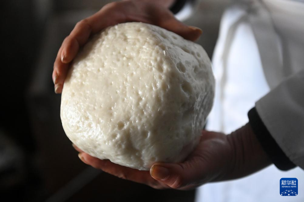 1月25日,在广西全州县全州镇,刘勇在展示制作米粉的大米粉团。