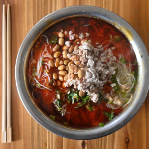 1月25日在广西全州县全州镇拍摄的刘勇做的红油米粉。