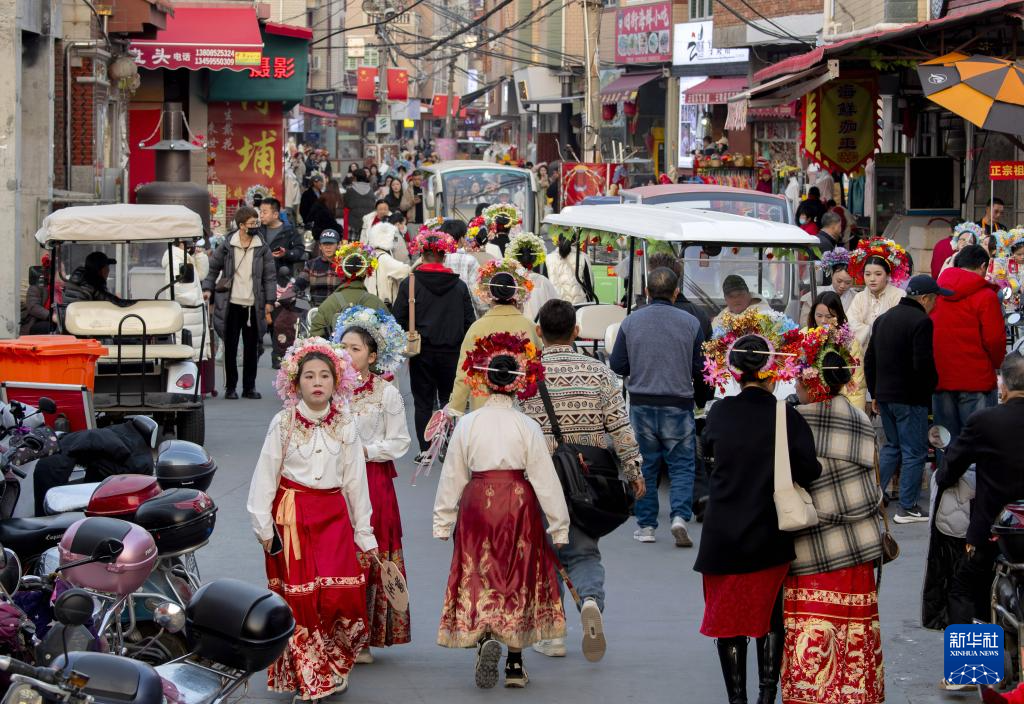 1月26日,头戴簪花的游客在福建省泉州市蟳埔村游览。