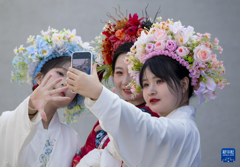 1月26日,头戴簪花的游客在福建省泉州市蟳埔村拍照留影。