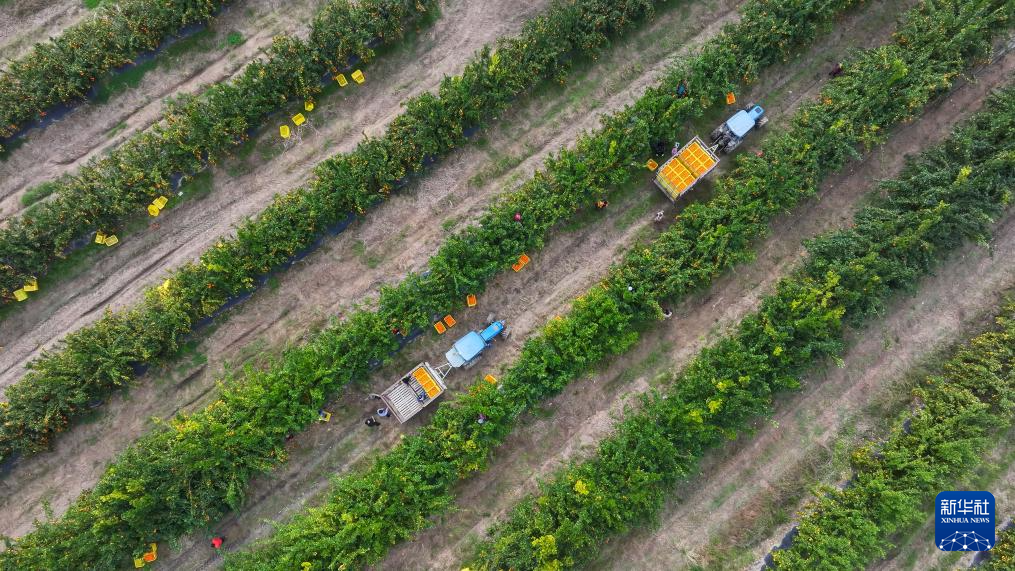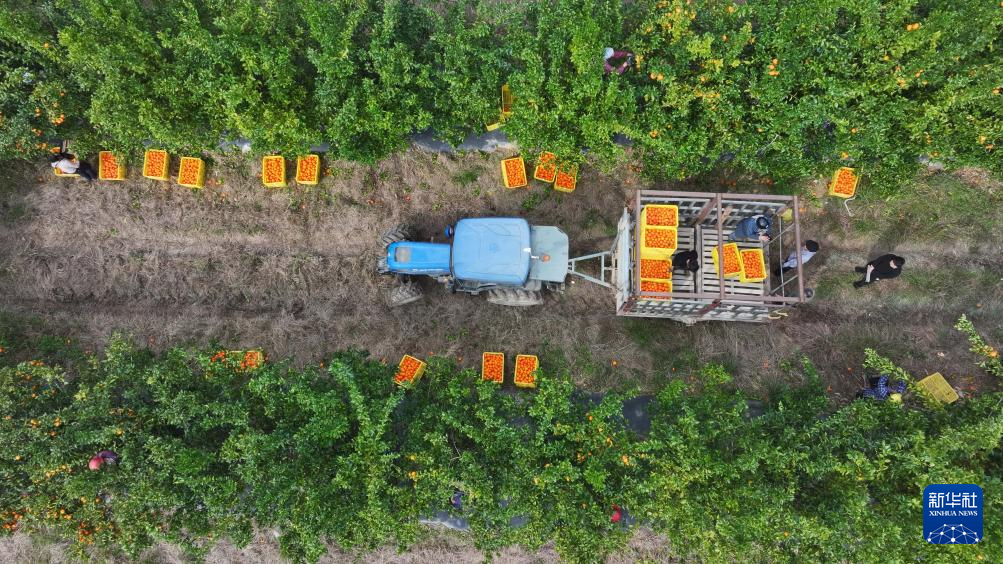 1月31日,村民在贵州省罗甸县木引镇水果基地采摘红橘(无人机照片)。