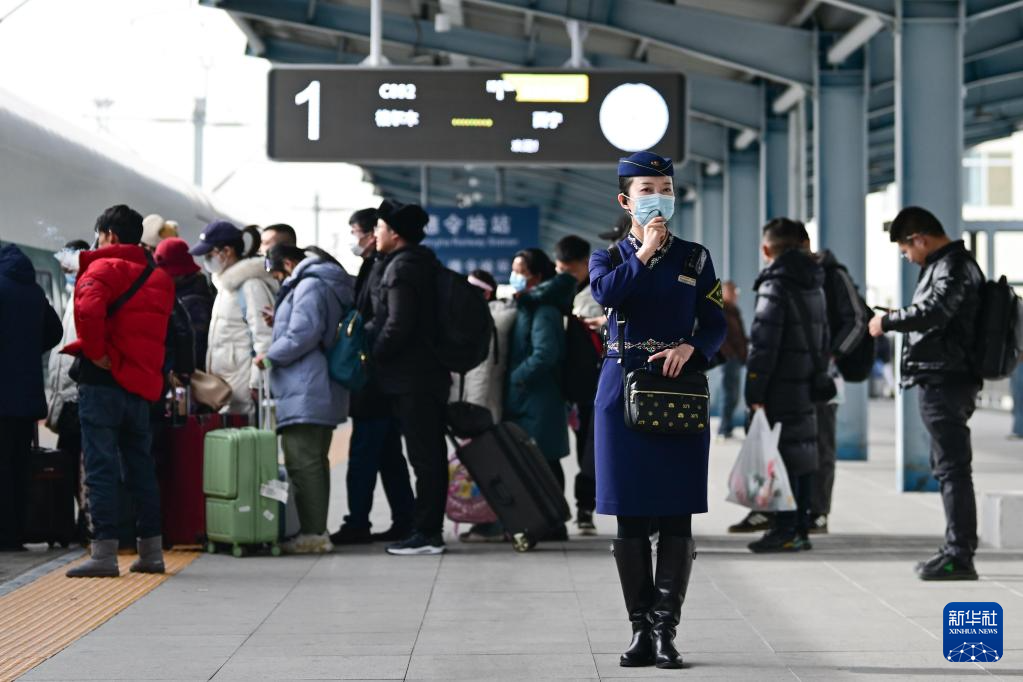 1月30日,中国铁路青藏集团有限公司西宁客运段动车队乘务员王璐在站台提示旅客登车。