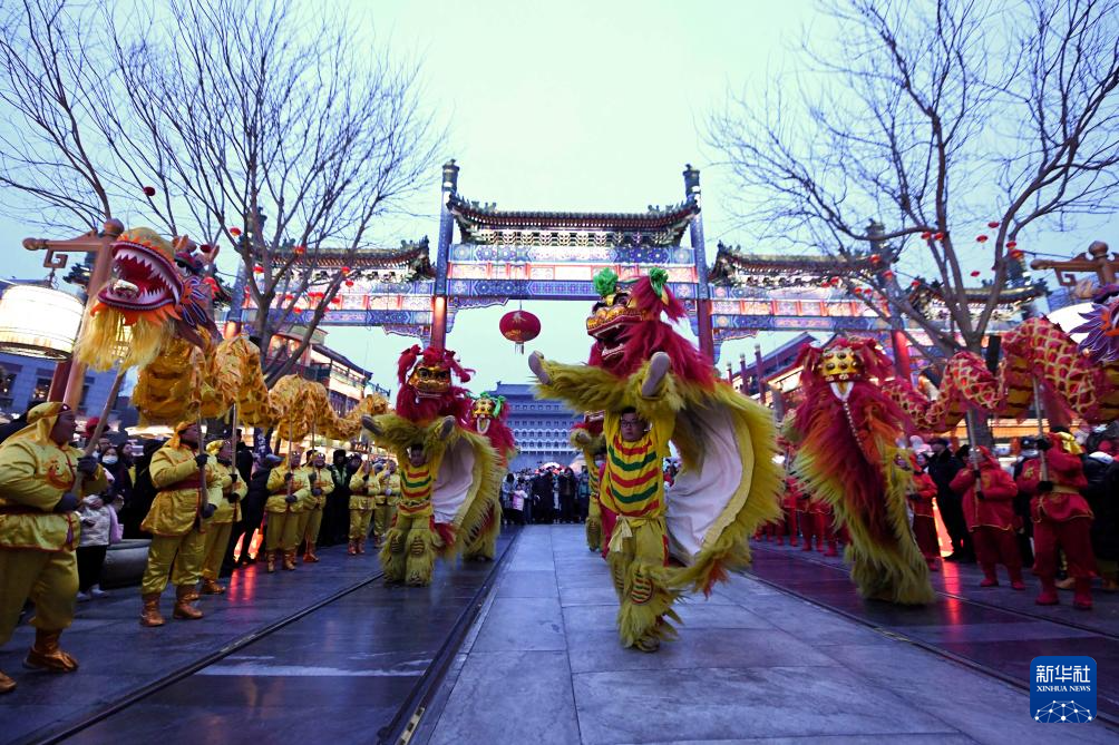 2月2日,演员在北京前门大街进行舞龙舞狮表演。
