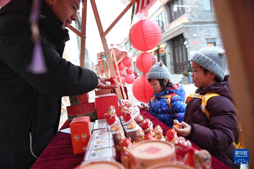 2月2日,小朋友在北京前门大街的国潮市集参观。