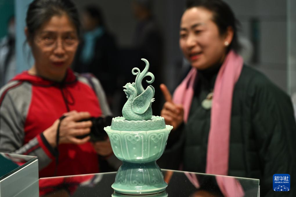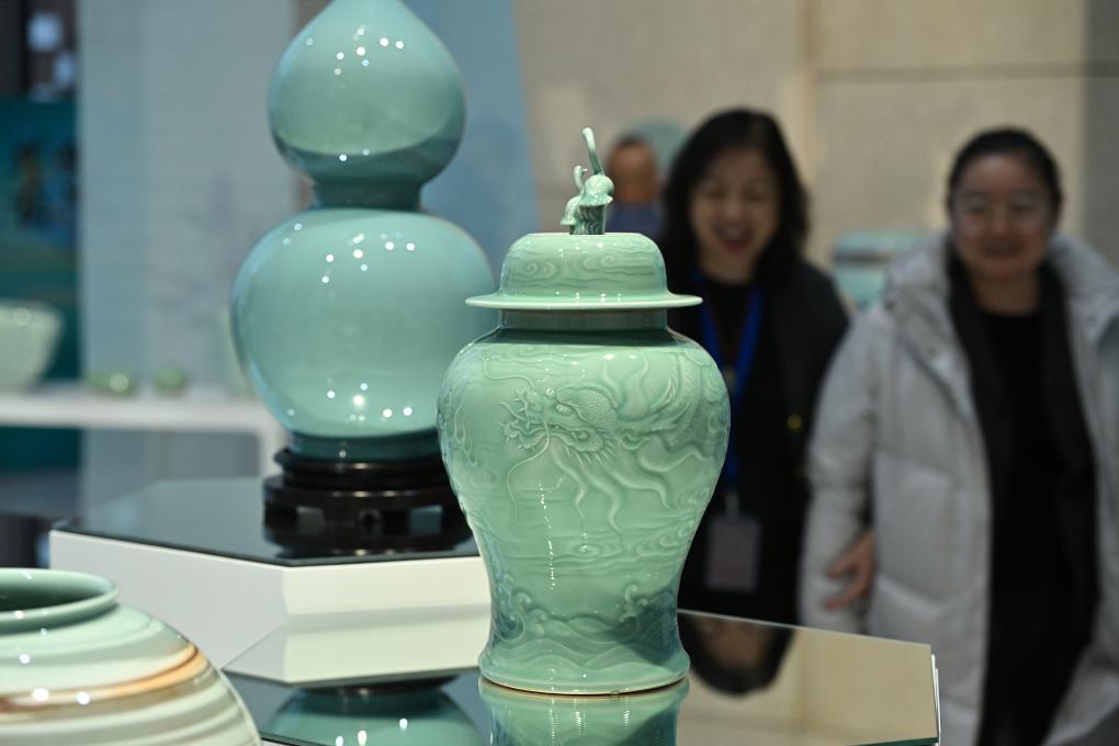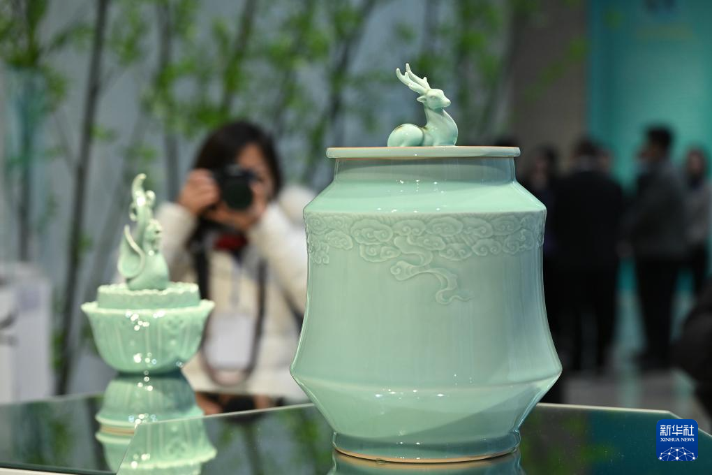 2月2日,参观者在展览上观看龙泉青瓷作品《凤鸣九天》。