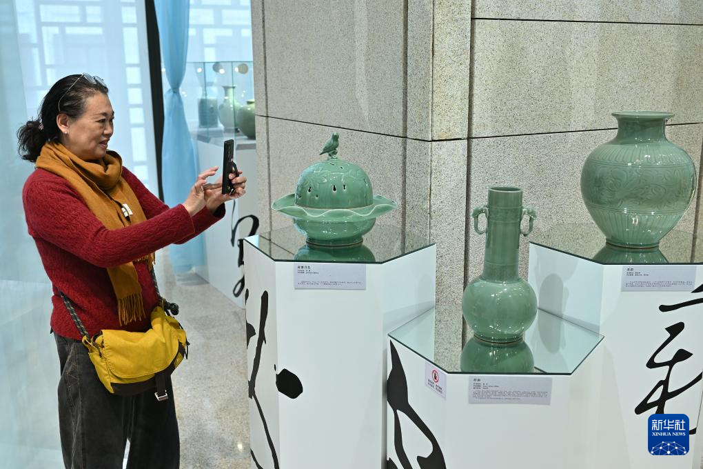 2月2日,参观者在展览上拍摄龙泉青瓷茶具。