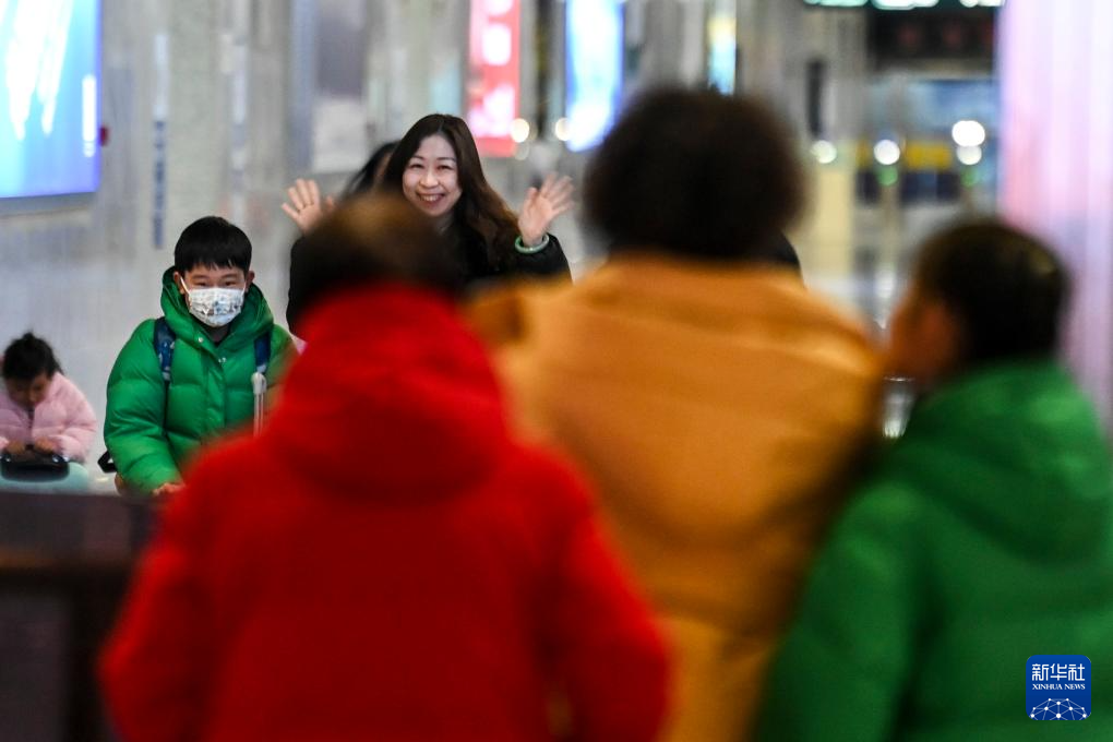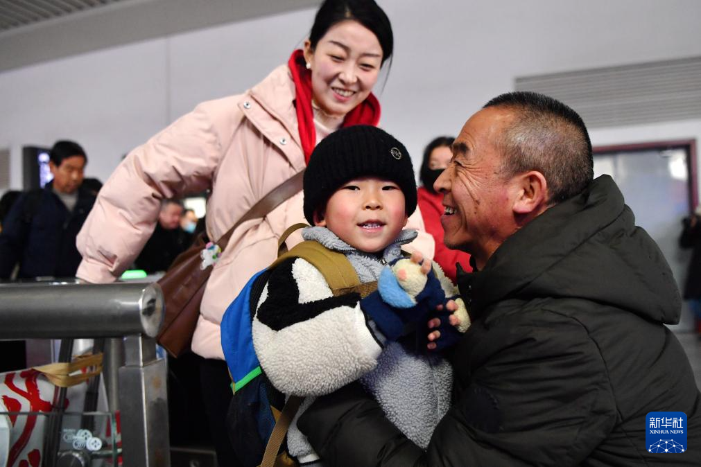 2月4日,张先生(右)在甘肃天水南站出站口迎接回家过年的外孙。