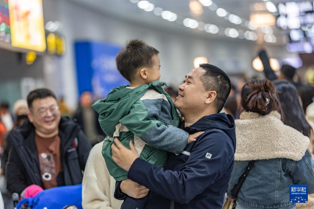 2月6日,在沈阳桃仙国际机场,在沈阳工作生活的哈尔滨人李海龙接儿子一起过年。