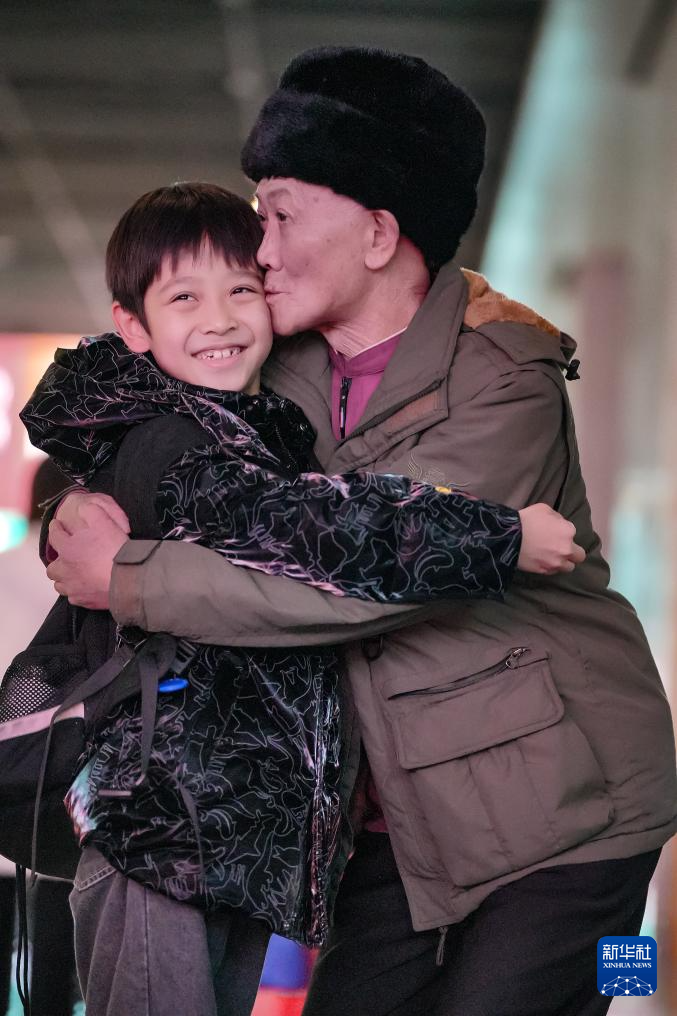 2月4日,一名老人在甘肃天水南站出站口与前来接站的孙子拥抱。
